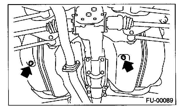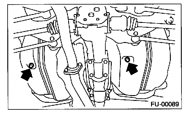 3. Drain the fuel from the fuel tank. Set a container under the vehicle and remove drain plug from fuel tank.