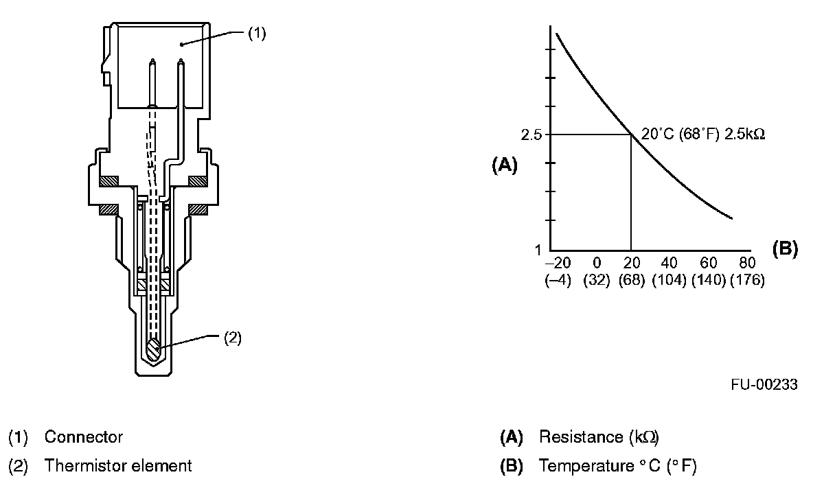 ENGINE COOLANT TEMPERATURE SENSORThe engine coolant temperature sensor is located on the engine coolant pipe. The sensor uses a thermistor whose resistance changes inversely with temperature. Resistance signals as engine coolant temperature information are transmitted to the ECM to make fuel injection, ignition timing, purge control solenoid valve and other controls.
