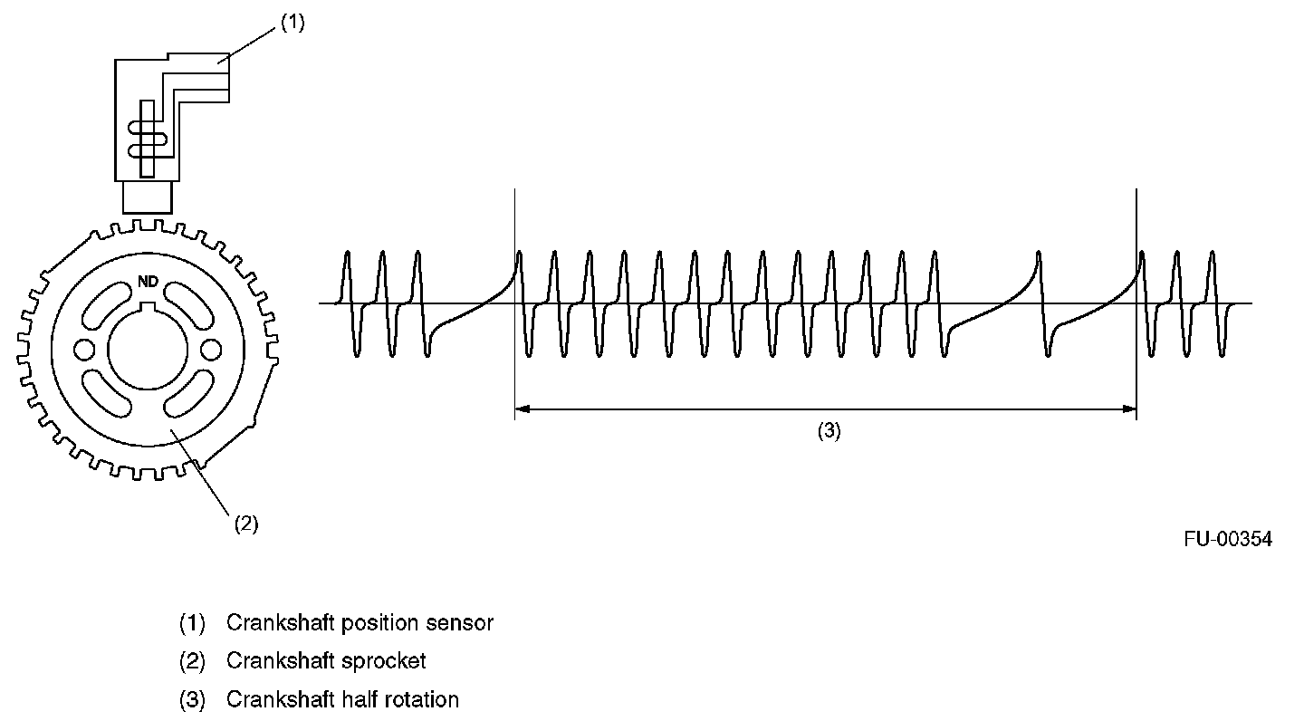 CRANKSHAFT POSITION SENSOR- The crankshaft position sensor is installed on the oil pump which is located in the front center portion of the cylinder block. The sensor generates a pulse when one of the teeth on the perimeter of the crankshaft sprocket (rotating together with the crankshaft) passes in front of it. The ECM determines the crankshaft angular position by counting the number of pulses.