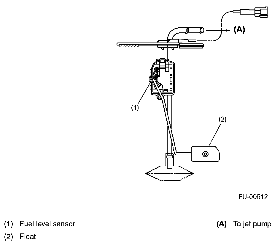 SUB-COMPARTMENT FUEL LEVEL SENSORThis sensor detects the level of the fuel in the sub-compartment (the compartment in which the fuel pump is not located) and acts as part of the fuel transfer line when the jet pump is in operation to maintain the fuel in both compartments at the same level.