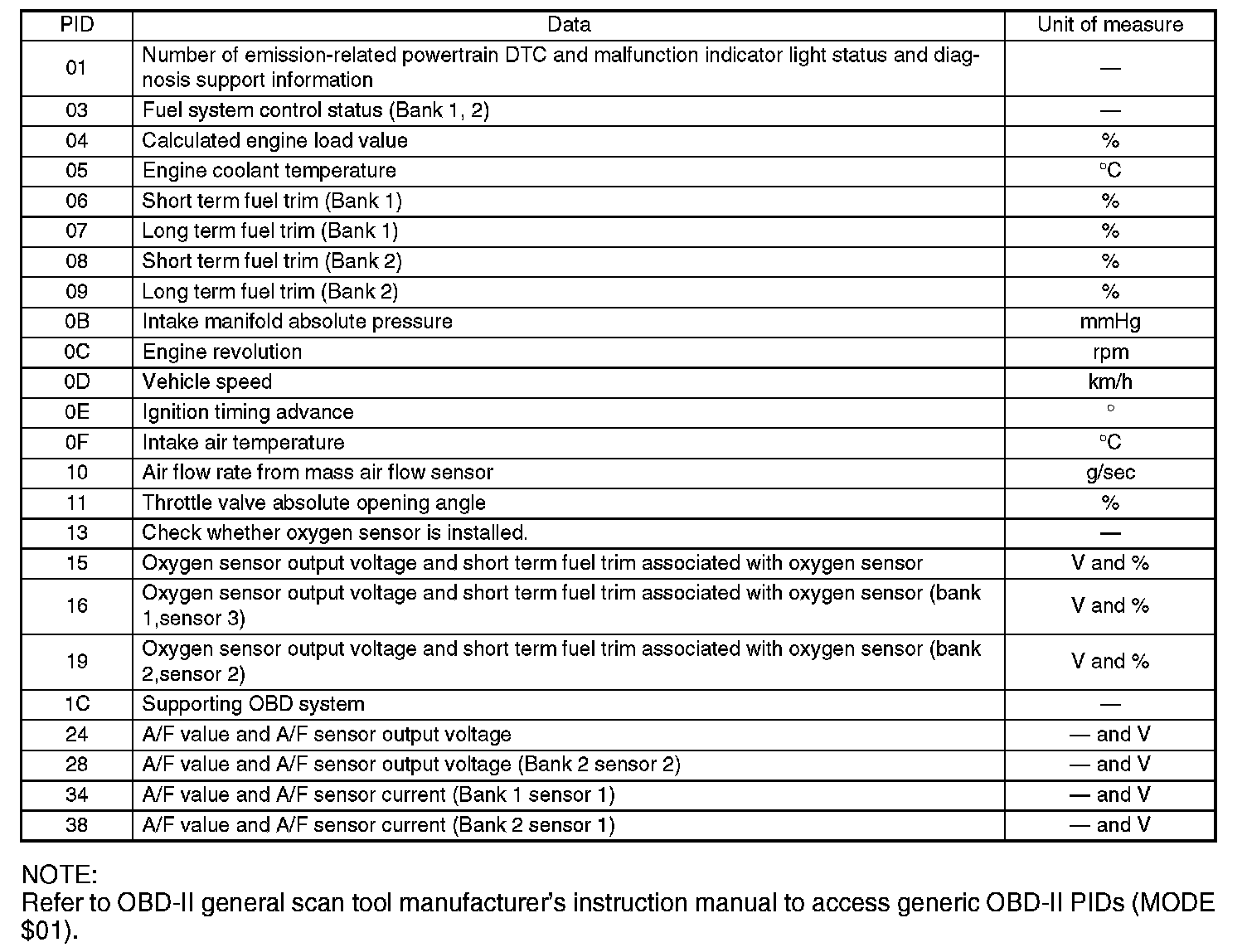 NOTE: Refer to OBD-II general scan tool manufacturer's instruction manual to access generic OBD-II PIDs ( MODE $01).