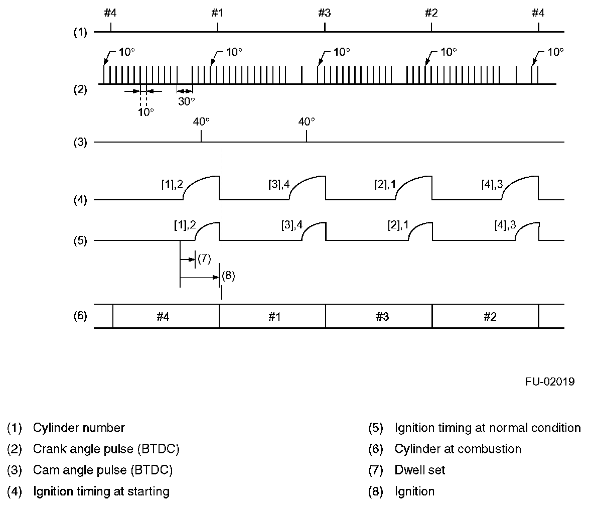 Engine speed fluctuates during start of the engine, so the ECM cannot control the ignition timing. During that period, the ignition timing is fixed at 10 ° BTDC by using the 10 ° signal from the crankshaft position sensor.