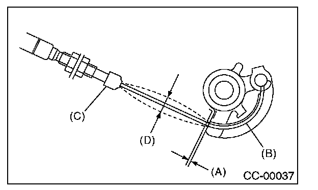 Check that the clearance (A) between throttle cam (B) and lever or cable deflection (D) is within specifications.