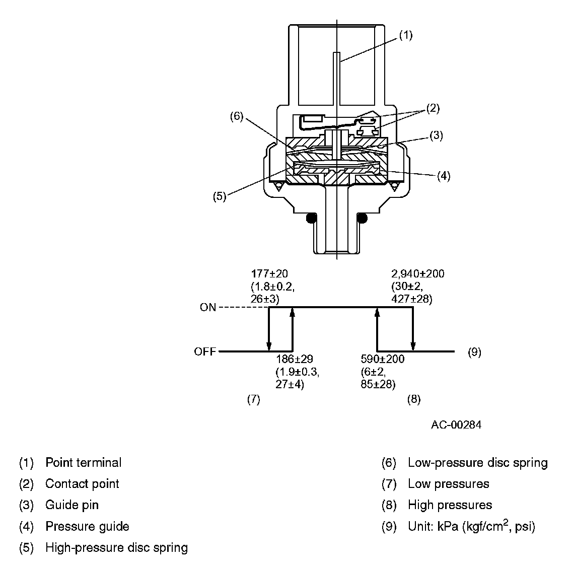 The pressure switch is located on the high-pressure line to the receiver drier. When an abnormally high or low pressure occurs in the high-pressure line, the pressure switch turns OFF to stop operation of the compressor.