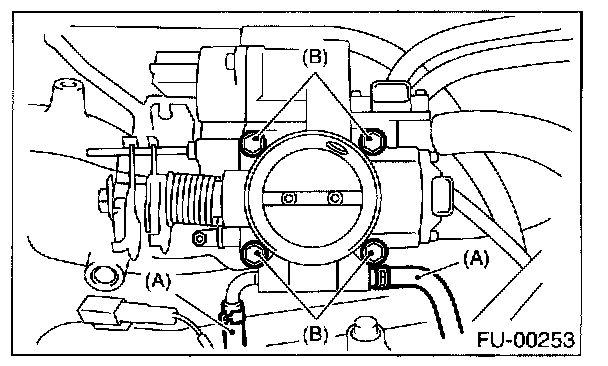 8. Remove bolts (B) which install throttle body to intake manifold.
