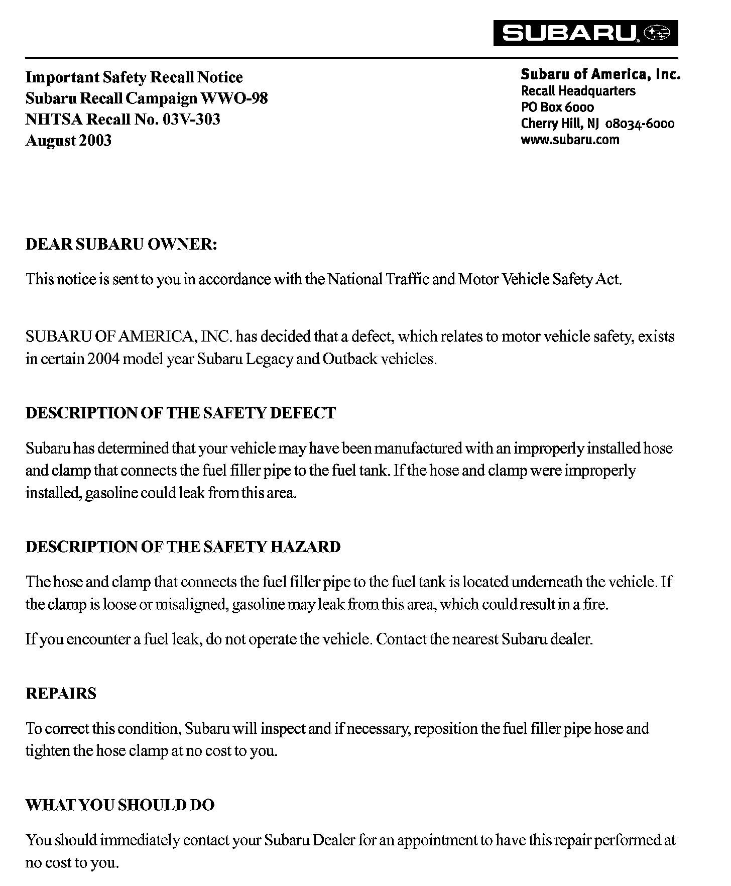 Notification letters have been sent to owners of affected vehicles. SOA has prepared and mailed those letters on August 25, 2003. A sample of this letter is shown.