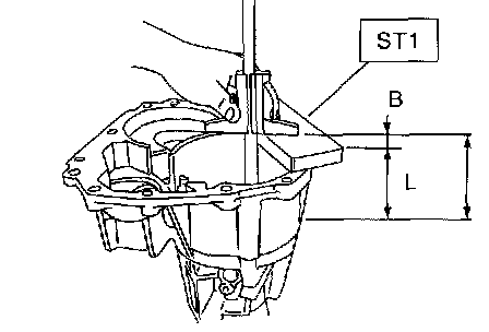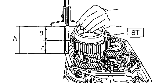 3. Using ST, measure height "l" from transmission case joining edge to center differential clutch drum edge.