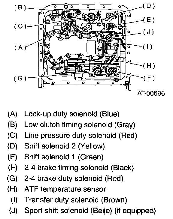11. Install the sensor, solenoids and duty solenoids to specified positions.
