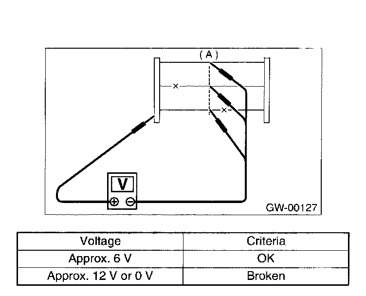 5. Apply positive lead of voltmeter to positive terminal of voltmeter, and then move negative lead along the wire up to the negative terminal end. If voltage changes from zero to several volts during movement of lead, heat wire is open at the voltage change point.