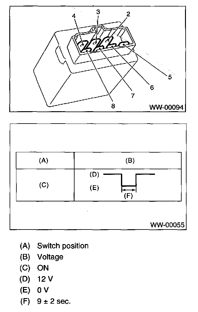 Apply battery voltage to the rear terminals 8 and 2, and then inspect the voltage of 6 and 2. (Measure the voltage from after the second time the wiper stops.)
