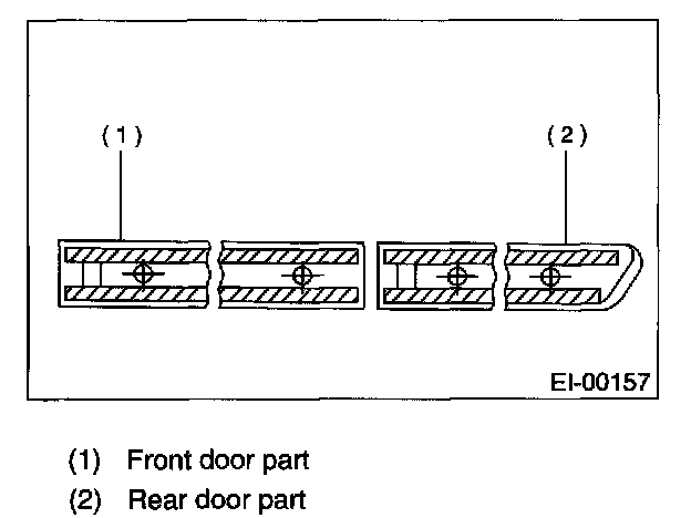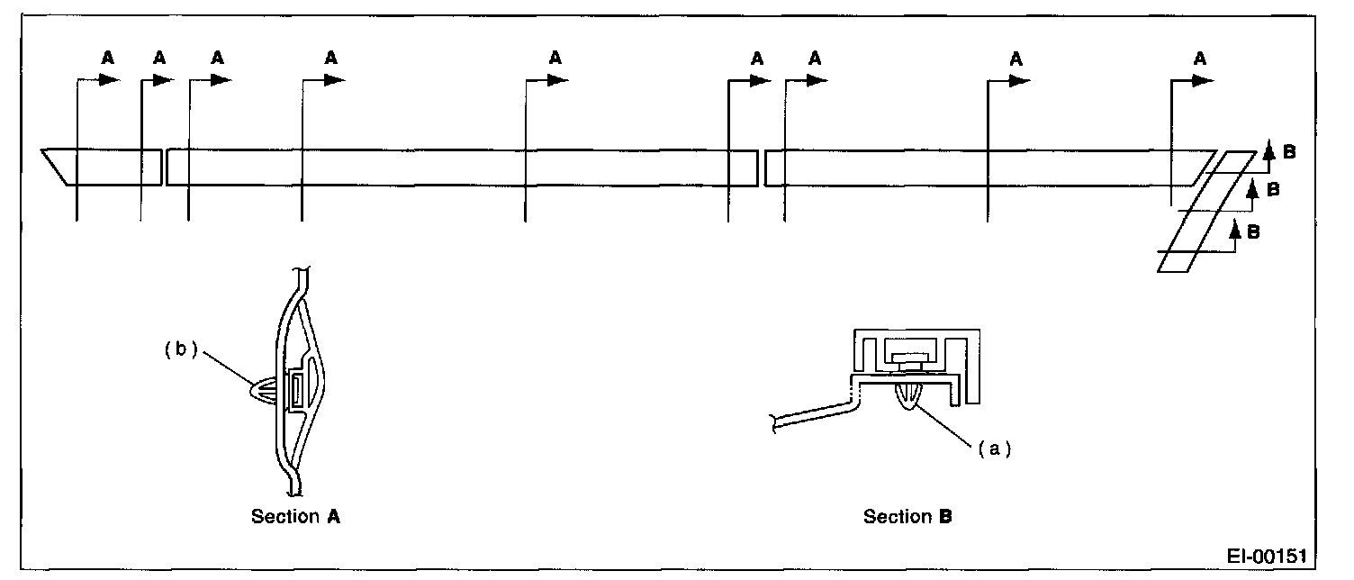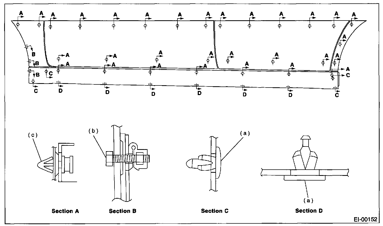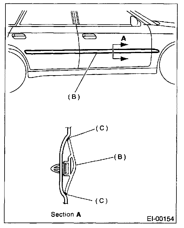 2. Insert fishing line [0.8 mm (0.031 in) dia.] (A) between side protector (B) and vehicle body. Cut (pull the line) through two-sided tape (C) along side protector on the body. Using a puller, remove clips from vehicle body while pulling side protector towards yourself as required.