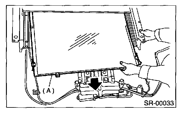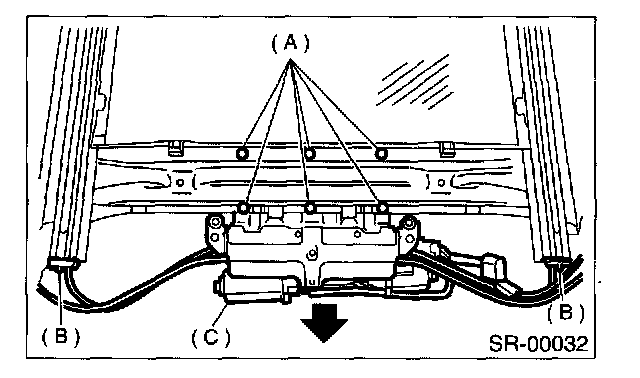3. Remove rail stoppers (B) then pull the motor assembly (C) in the direction shown in the figure.