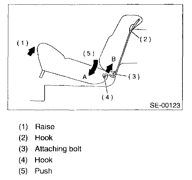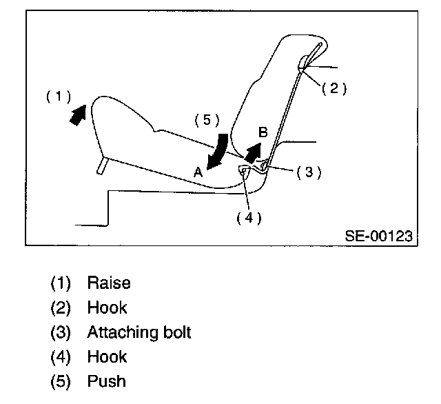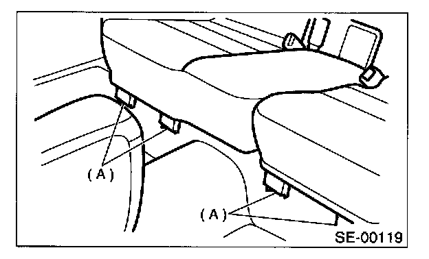 1. Slightly raise front of cushion while pushing down on cushion in the direction of "A". With cushion held in that position, move it forward until it is unhooked.