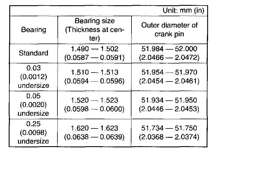5. Measure the oil clearance on individual connecting rod bearings by means of plastigauge. If any oil clearance is not within specification, replace the defective bearing with a new one of standard size or undersize as necessary. (See the table below.)