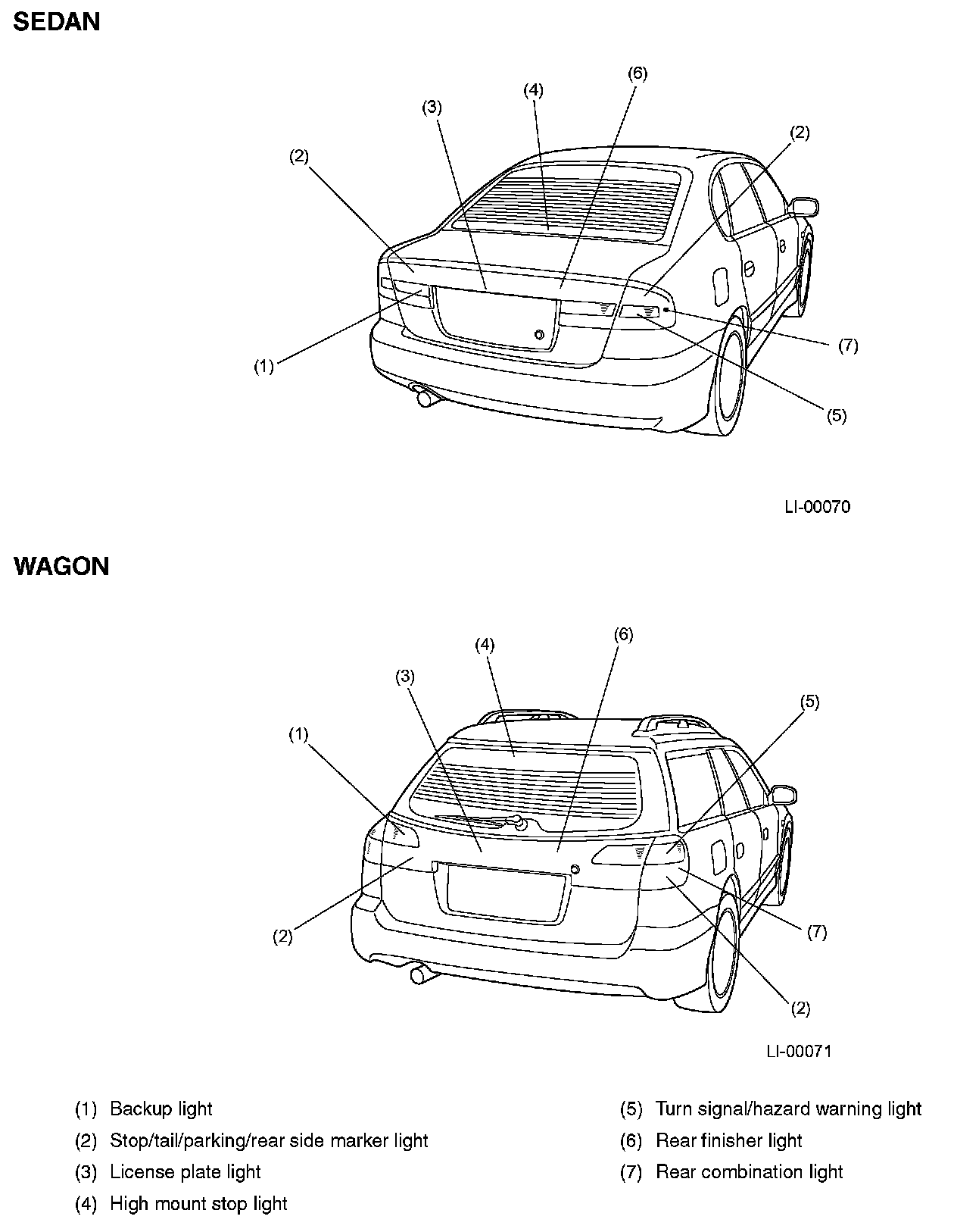 The rear turn signal/hazard warning light, stop/tail/parking light, and the backup light are incorporated into the rear combination light and rear finisher light. The side marker light and rear reflex reflector are also incorporated into the rear combination light.