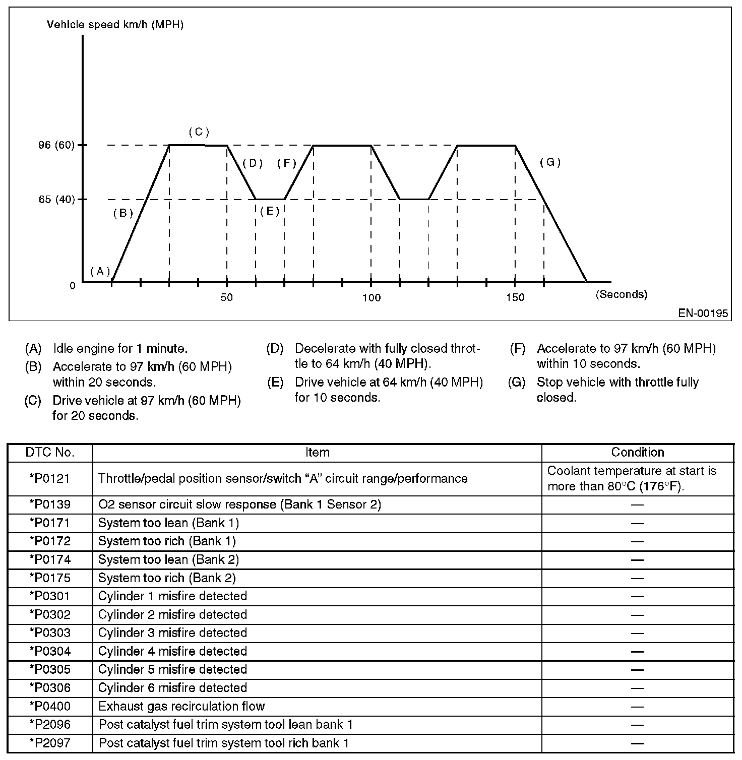 There are 3 drive patterns for trouble diagnosis. Driving in the specified pattern allows to diagnose the malfunctioning items listed below. After the malfunctioning items listed below are repaired, always check whether they correctly resume their functions by driving in the required drive pattern.