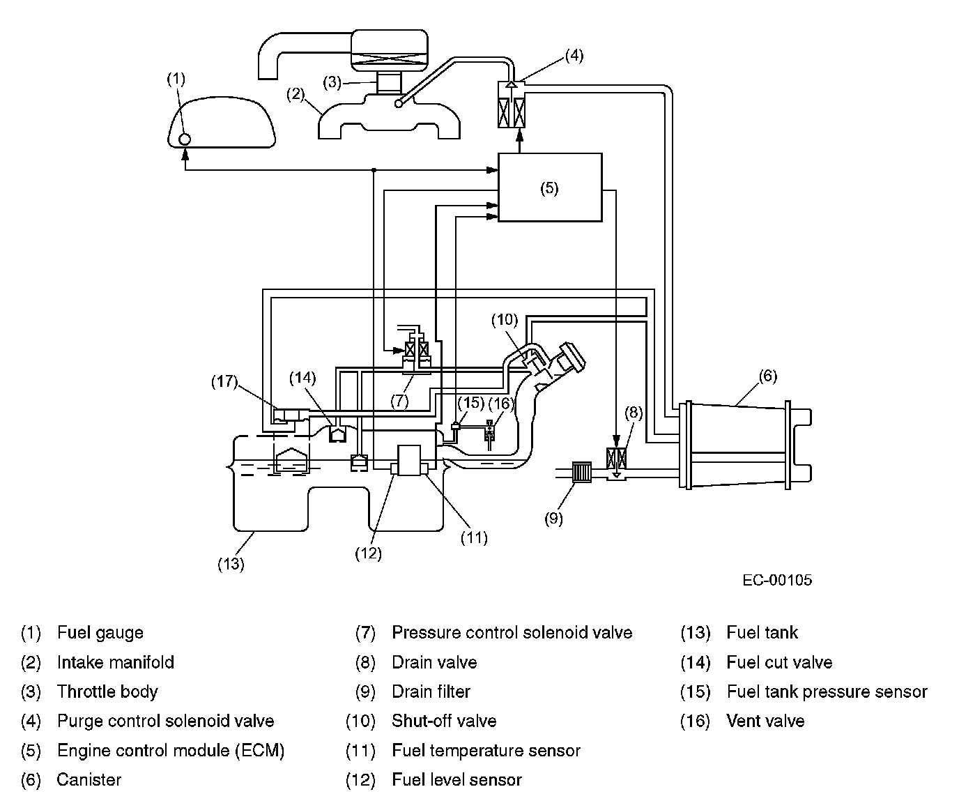- The evaporative emission control system prevents fuel vapors from escaping into atmosphere. This system includes a canister, purge control solenoid valve, fuel cut valve, and the lines connecting them.