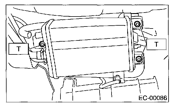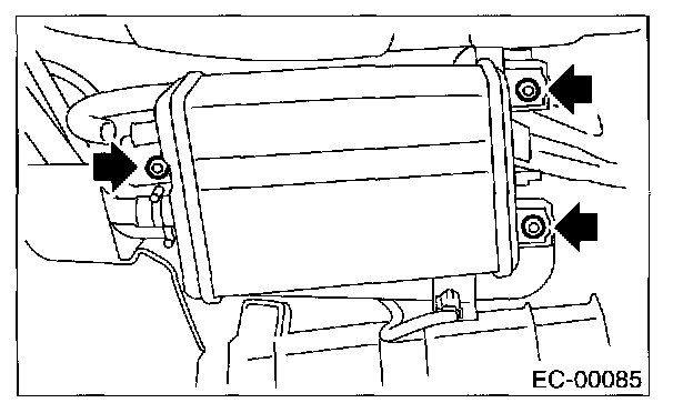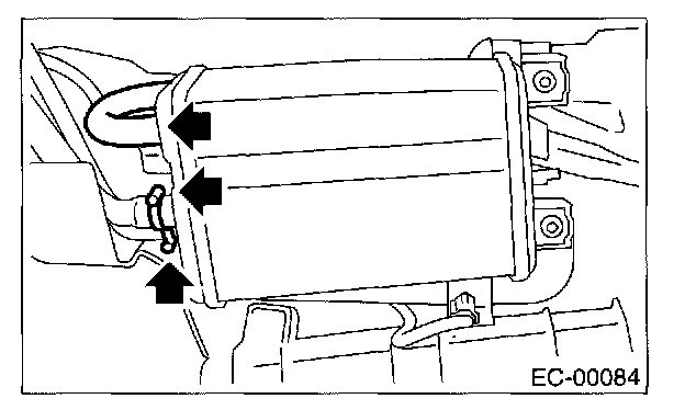 Loosen two clamps which hold two canister hoses, and disconnect three evaporation hoses from canister.