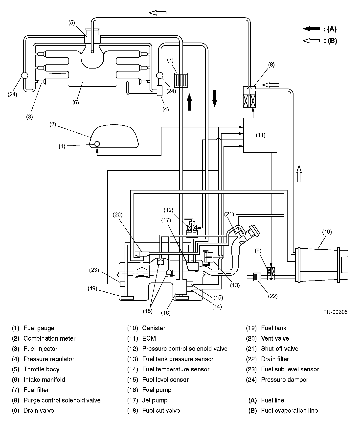 - The fuel pressurized by the fuel tank inside pump is delivered to each fuel injector by way of the fuel pipe and fuel filter. Fuel injection pressure is regulated to an optimum level by the pressure regulator.