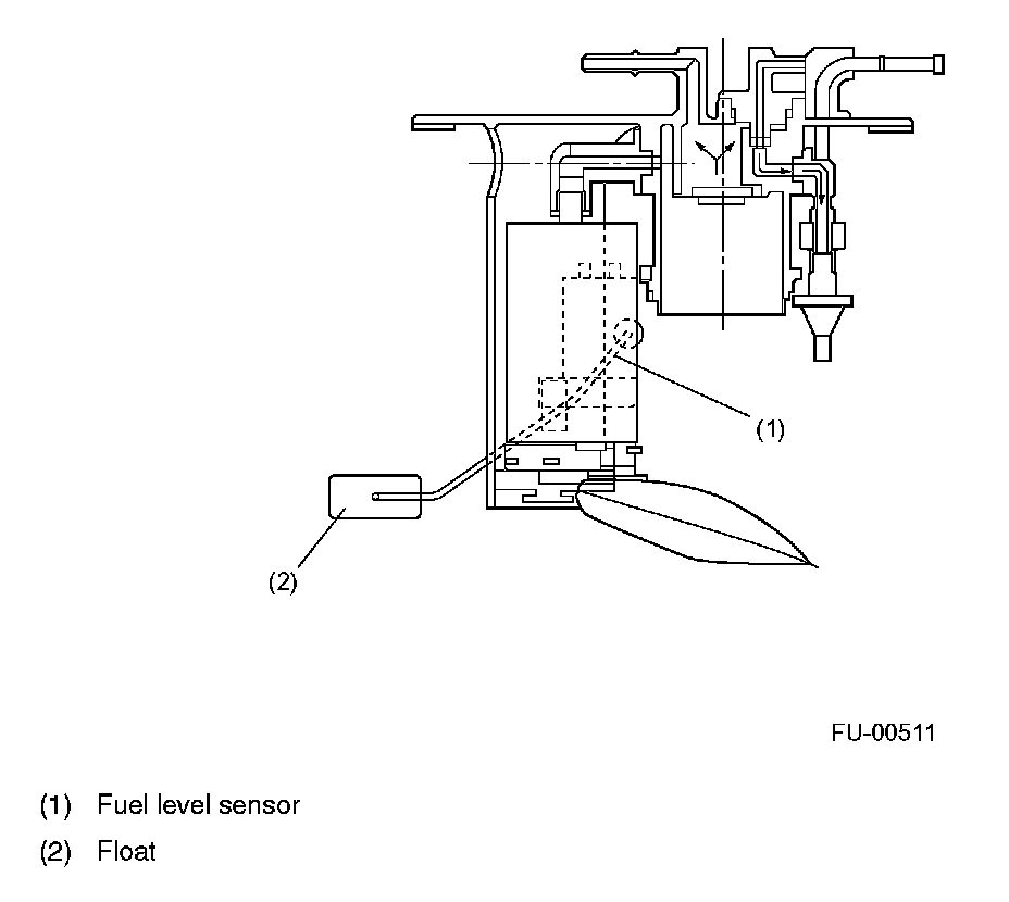 The fuel level sensor forms part of the fuel pump and located in the fuel tank. The sensor outputs an electric resistance signal that varies with movement of its float to indicate the level of the fuel remaining in the tank.