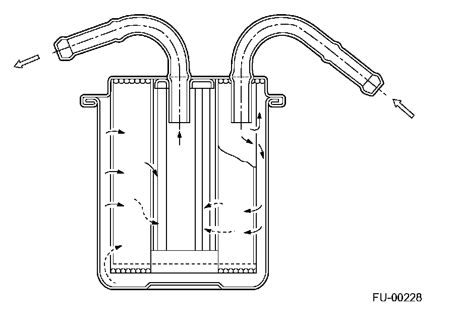 The fuel filter located in the engine compartment is a pressure-withstanding, cartridge type. It has a filter element in a metal case. The fuel entering the filter flows from the perimeter of the element to the center of the filter and goes out from there.