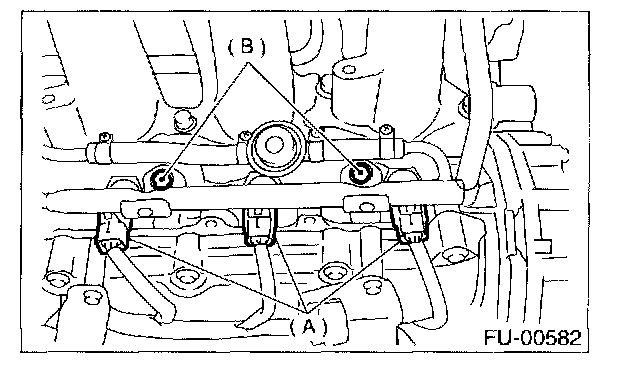 12. Remove bolt (B) which holds injector pipe onto cylinder head.