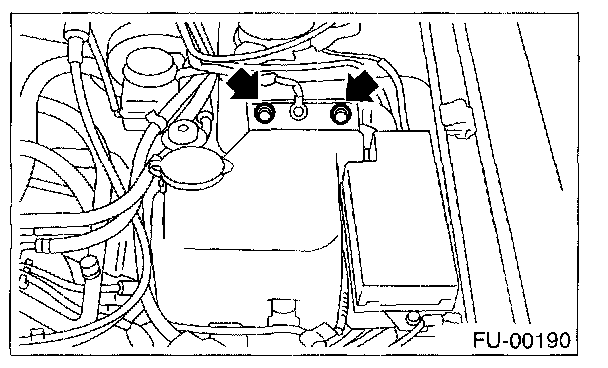 4. Remove two bolts which install washer tank on body.