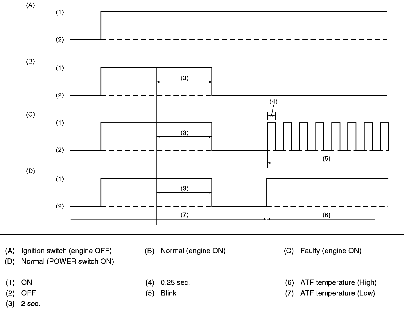 When any on-board diagnostics item is malfunctioning, the display on AT OIL TEMP warning light blinks from the time malfunction is detected after starting the engine until ignition switch is turned to OFF. The malfunctioning part or unit can be determined by a DTC during on-board diagnostics operation. Problems which occurred previously can also be identified through the memory function. If the AT OIL TEMP warning light does not show a problem (although a problem is occurring), the problem can be determined by checking the performance characteristics of each sensor using select monitor. The AT OIL TEMP warning light signal is as shown in the figure.