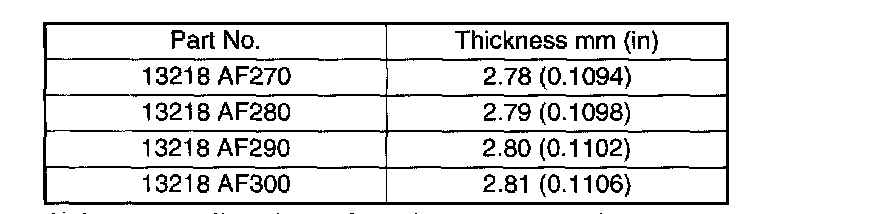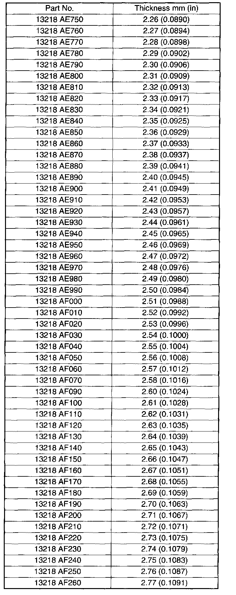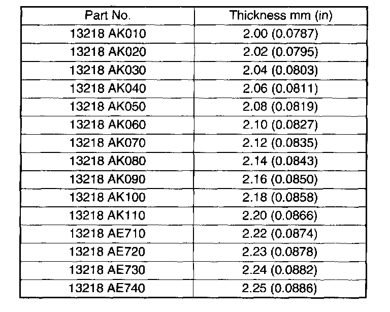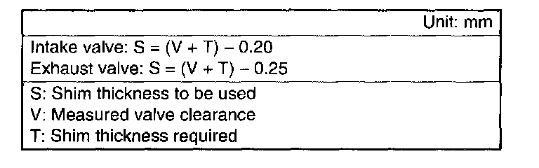 4. Select a shim of suitable thickness using measured valve clearance and shim thickness, by referring to the following table.