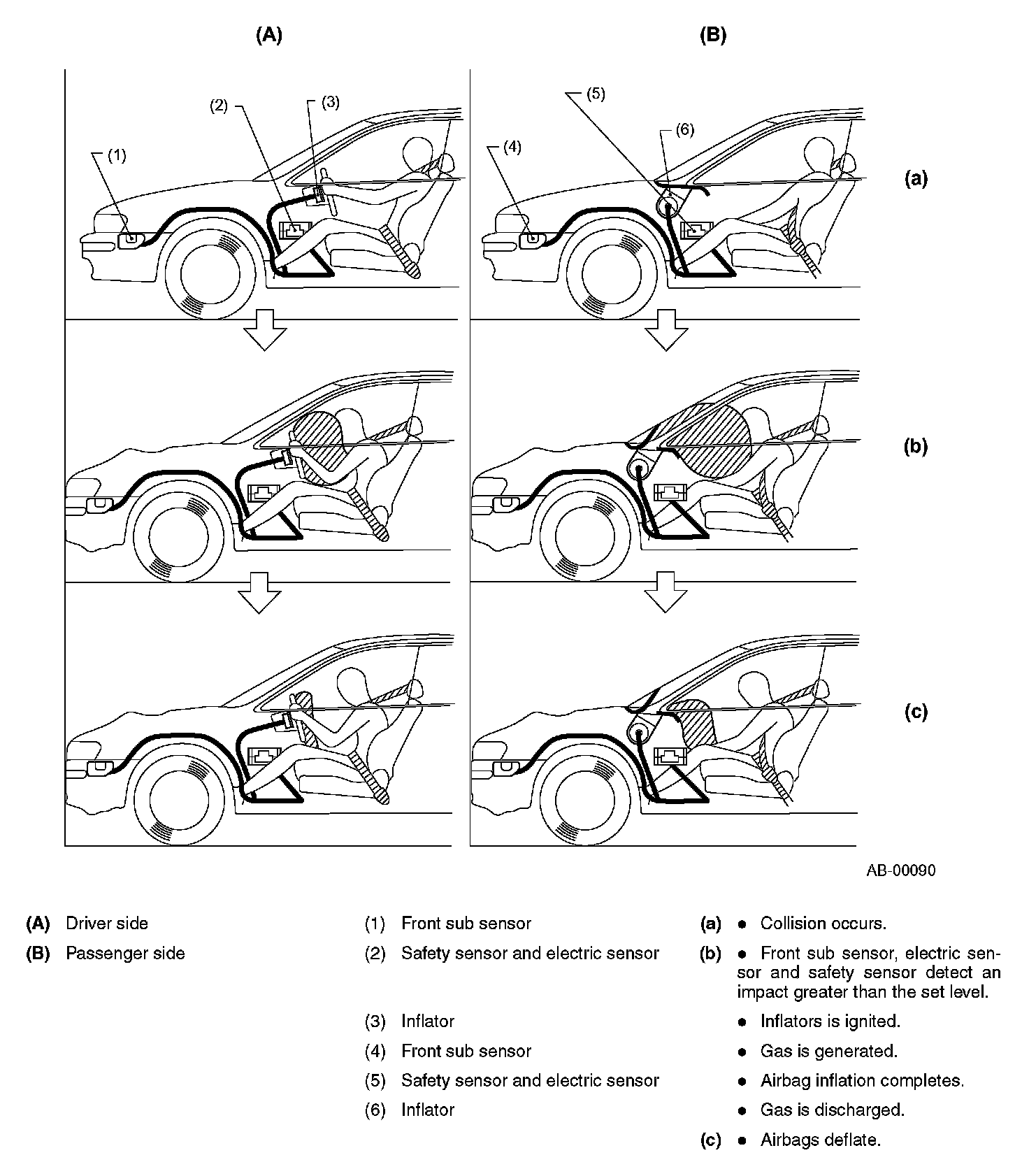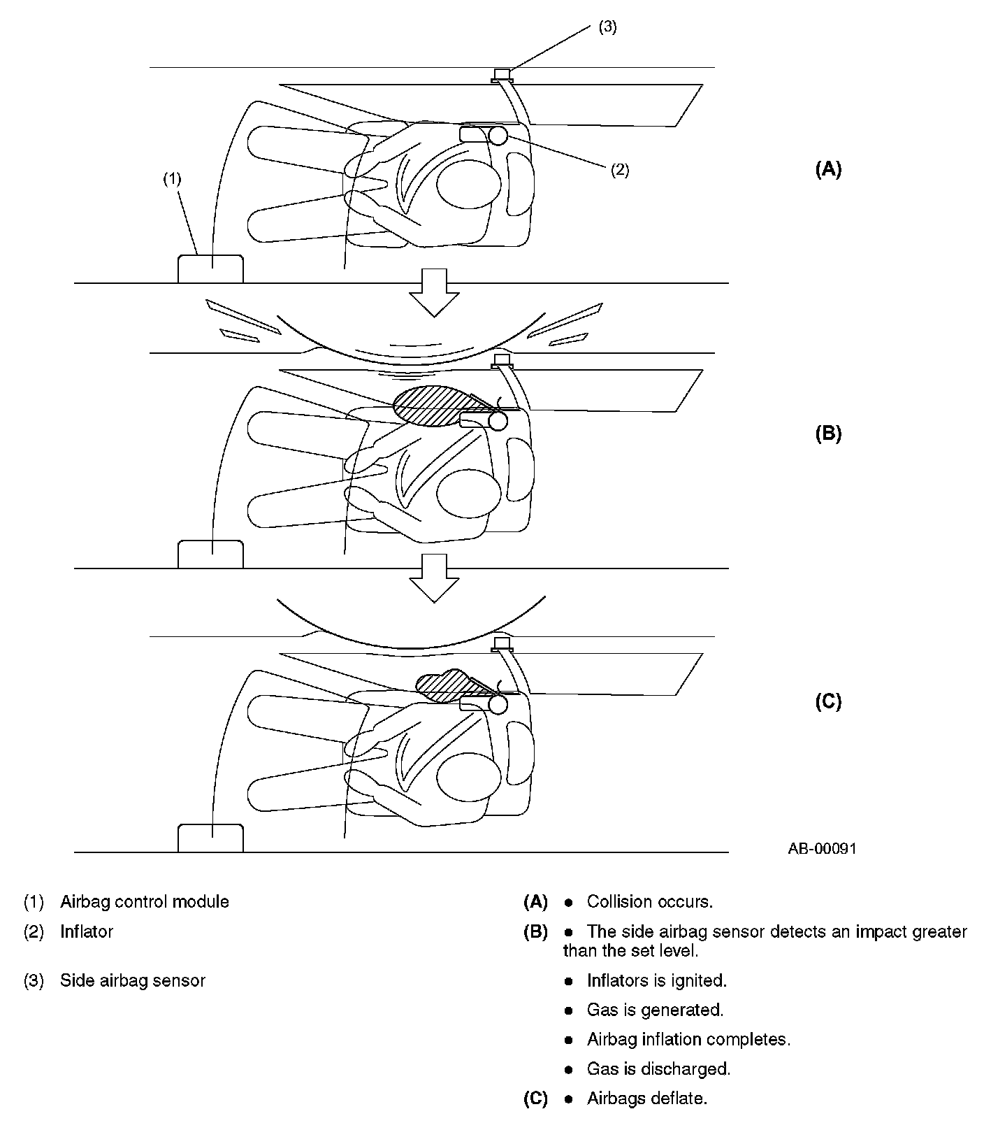 The side airbags provide the driver and front passenger with a restraint supplementary to that by the seat belts in the event of a side-on collision. When an impact greater than the set level is applied to either side of the vehicle, the relevant side airbag sensor sends an ignition signal to the corresponding airbag control module. The airbag control module activates the side airbag module to inflate the airbag, thus reducing the shock inflicted in the outside upper body (chest) of the driver or front passenger.