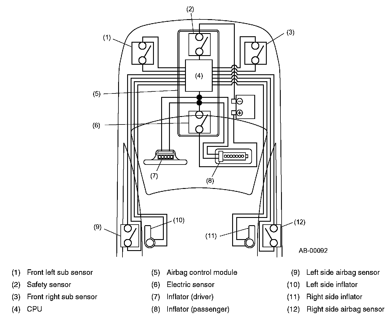 The airbag system consists of an airbag control module, left and right front sub sensors, an electric sensor and safety sensor built into the control module, driver's and passenger's airbag modules each containing an inflator and airbag, and side airbag sensors and side airbag modules each containing an inflator and airbag (side airbag equipped model).