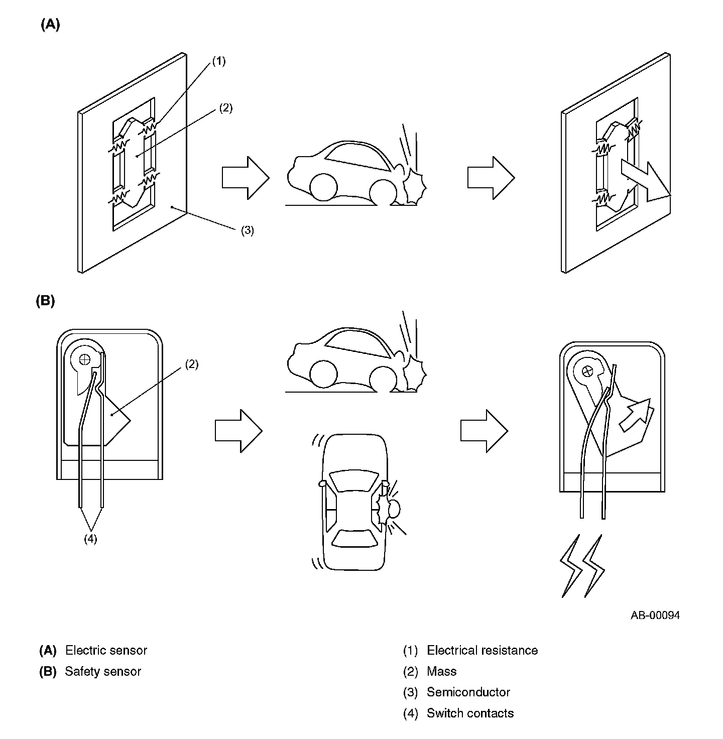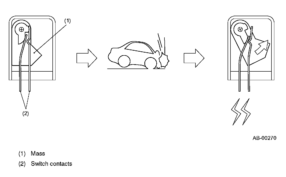 The safety sensor is also a pendulum type sensor. If the sensor receives a frontal or side impact exceeding a certain limit, the mass in the sensor moves in the direction opposite to the impact direction to turn the switch ON.