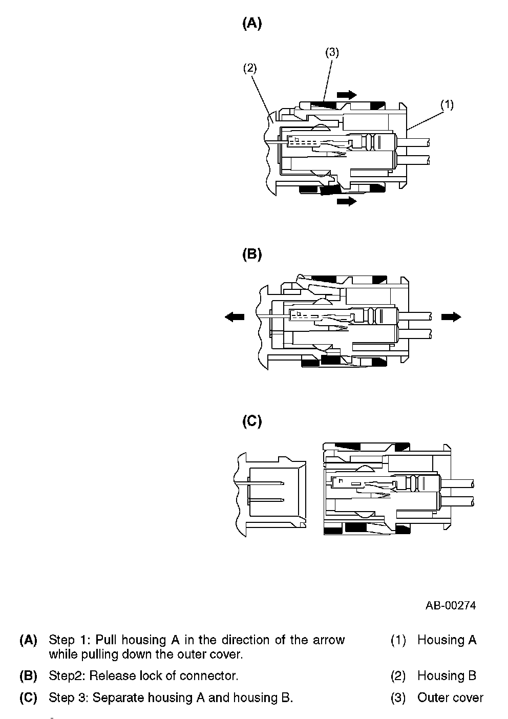 Press the lever (A) to let the green lever (B) pop out.This unlocks the double lock mechanism.Then separate the connector halves by pulling them apart while pressing the lever (A).