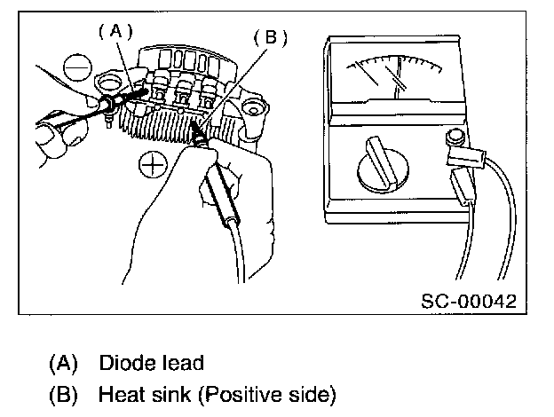 Check for continuity between the diode lead and positive side heat sink. The positive diode is in good condition if resistance is 1 Ohm or less only in the direction from the diode lead to heat sink.