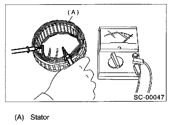 Inspect the stator coil for continuity between stator core and each end of lead wire. If resistance is 1 Ohm or less, the stator coil is grounded, and so replace the stator assembly.