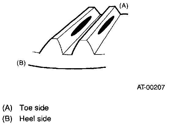 Checking item: Tooth contact pattern is slightly shifted toward to toe side under no-load rotation. [When loaded, contact pattern moves toward heel.]