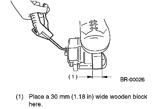 3. Place a wooden block as shown in the figure to prevent damage to the piston. Gradually supply compressed air via inlet of the brake hose to force piston out.