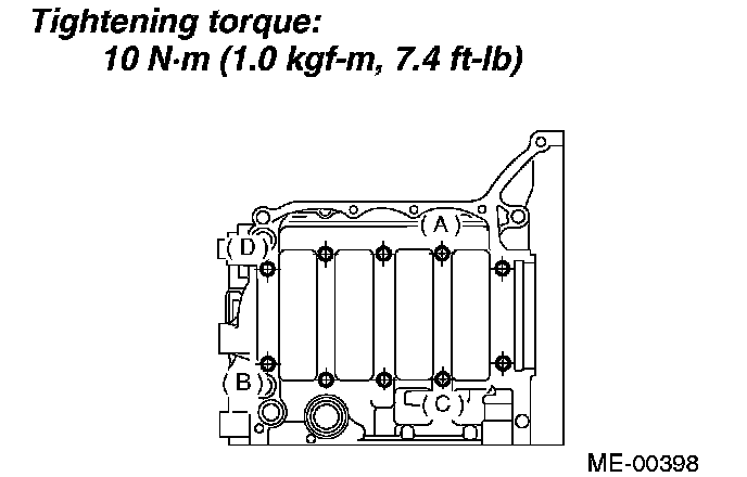 6. Tighten bolts (A to D) on left side of cylinder block more in alphabetical sequence.