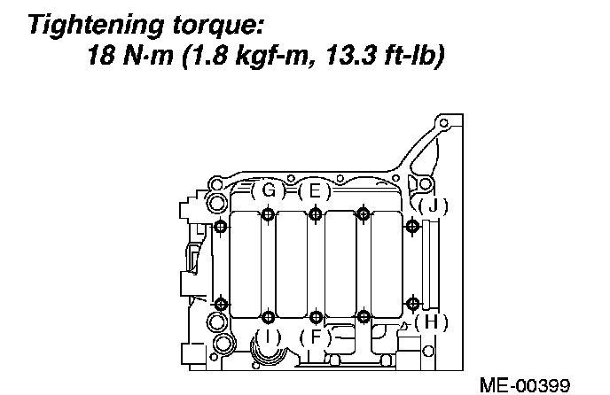 7. Tighten bolts (E to J) on right side of cylinder block more in alphabetical sequence.