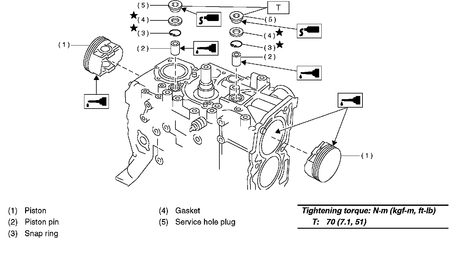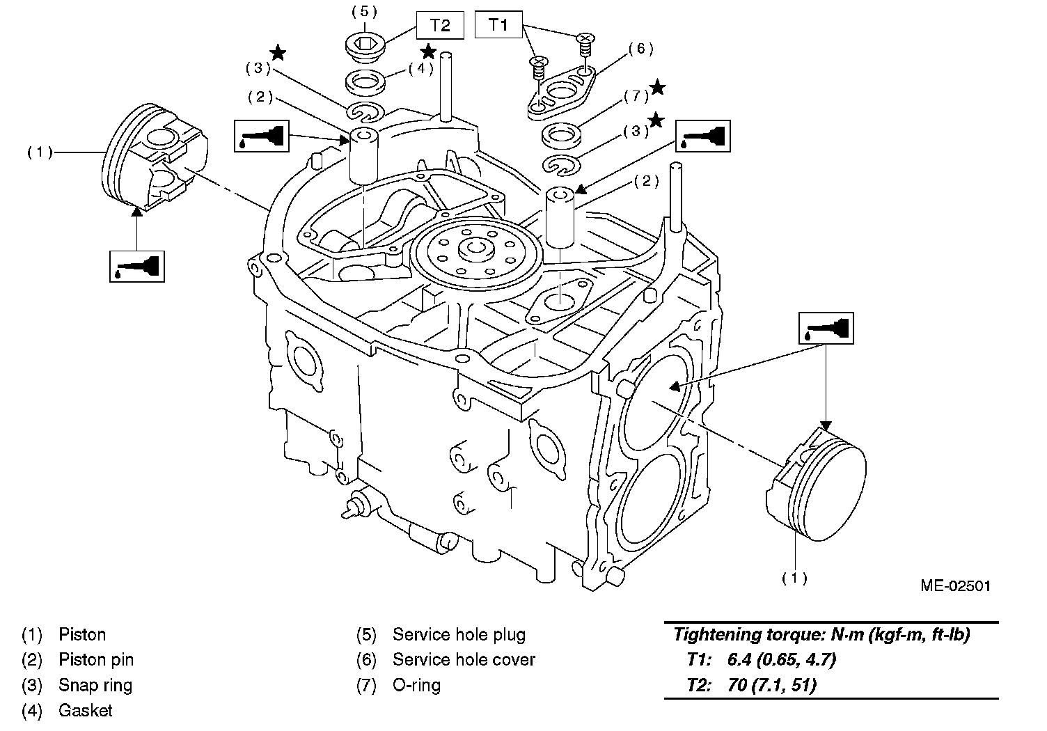 3 Apply a coat of engine oil to piston pin and insert piston pin into piston and connecting rod through service hole.