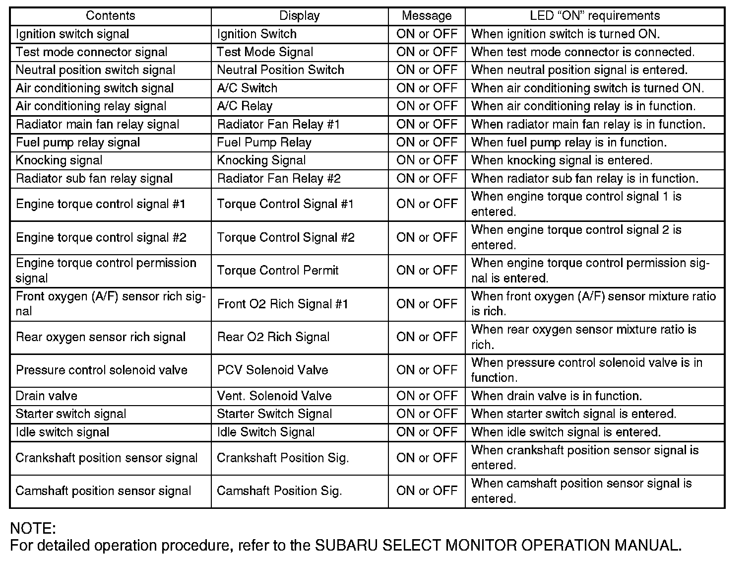 6. Using Subaru Select Monitor, call up diagnostic trouble code(s) and various data, then record them.