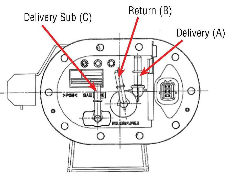 5) Please use caution and observe the following instructions when separating the fuel pump line connections. Note: The larger fuel line retainer clamp used on line "A" will be replaced during reassembly. However, the smaller retainer clamps used on lines "B" and "C" will be reused so use care not to cause damage during disassembly.