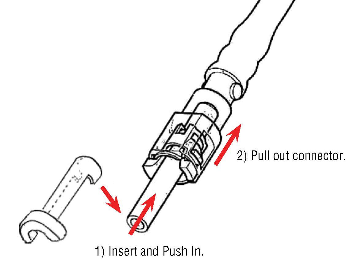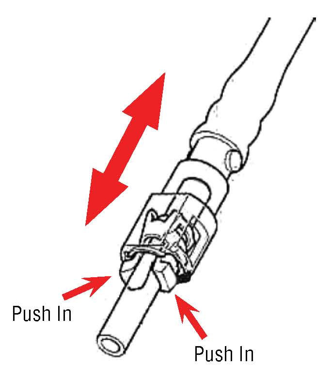 The special tool: 42099AE000, which is set up to separate fuel hoses with quick connectors in the engine compartment, can also be used for return and delivery sub hoses. The quick connector can be unlocked by inserting the special tool around the pipe and pushing it forward as