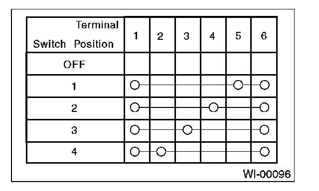 3. Symbol "O--O" indicates that continuity exists between two points or terminals. For example, when a switch position is "3", continuity exists among terminals 1, 3 and 6, as shown in table.