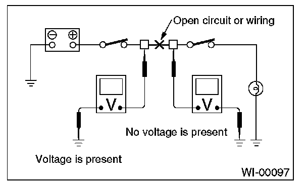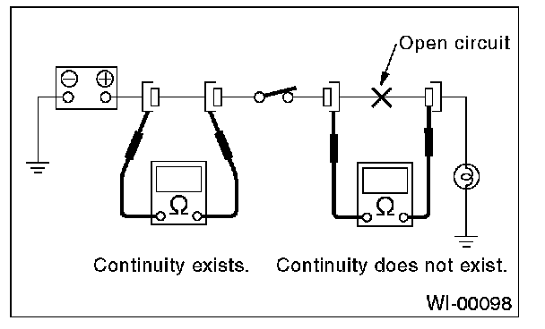 Disconnect all connectors affected, and check the continuity in wiring between adjacent connectors. When the ohmmeter indicates "infinite", the wiring is open.