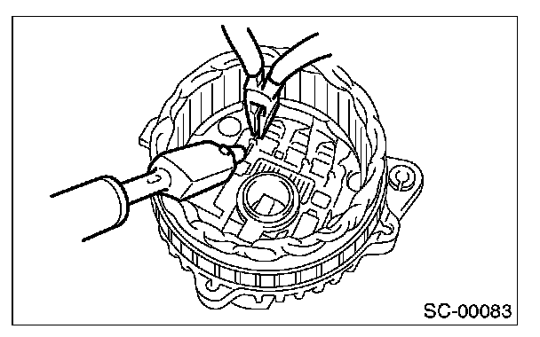 Before assembling, press the brush down into brush holder, and then fix them in that position by passing a [1 mm (0.08 in) dia. length 4 to 5 cm (1.6 to 2.0 in)] wire through the hole shown in the figure.