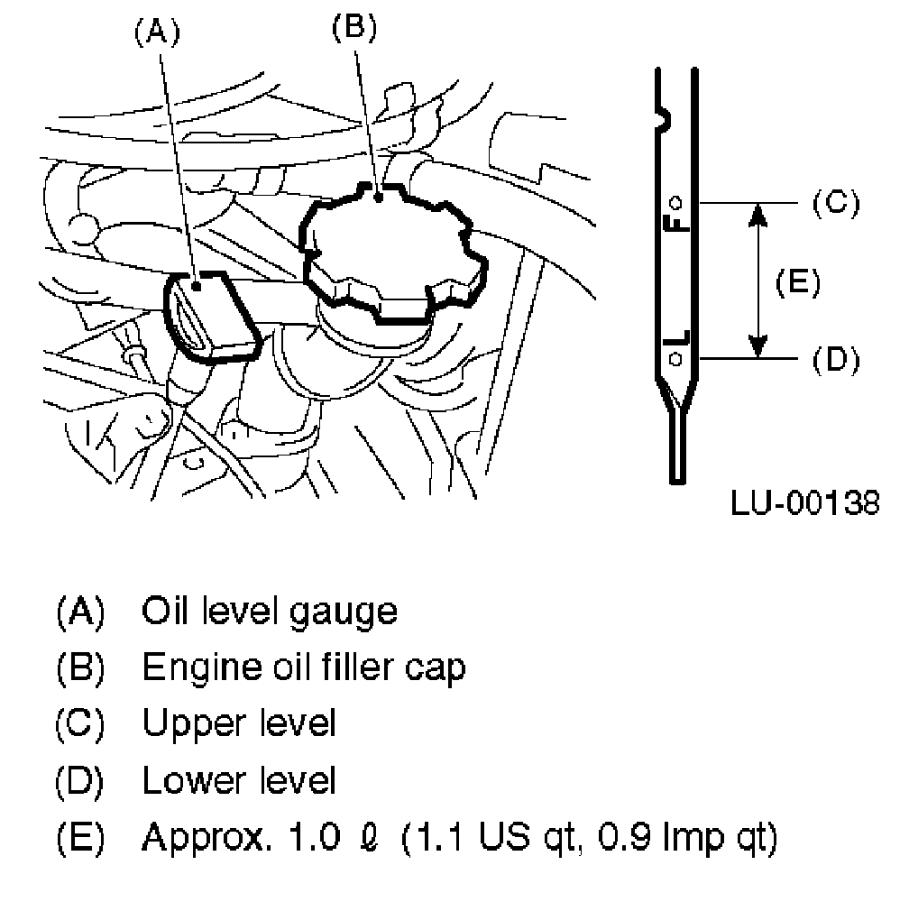 CAUTION: When replenishing oil, it does not matter if the oil to be added is a different brand from that in the engine; however, use oil having the API classification and SAE viscosity No. designated by SUBARU.