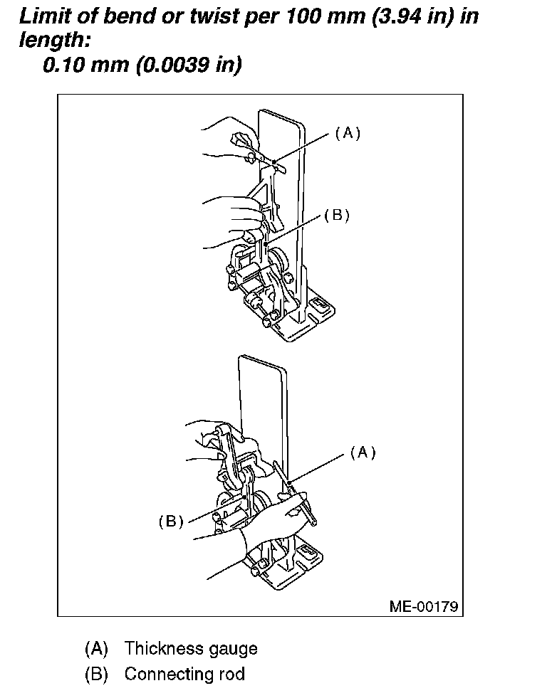 2) Check for bend or twist using a connecting rod aligner. Replace the connecting rod if the bend or twist exceeds the limit.