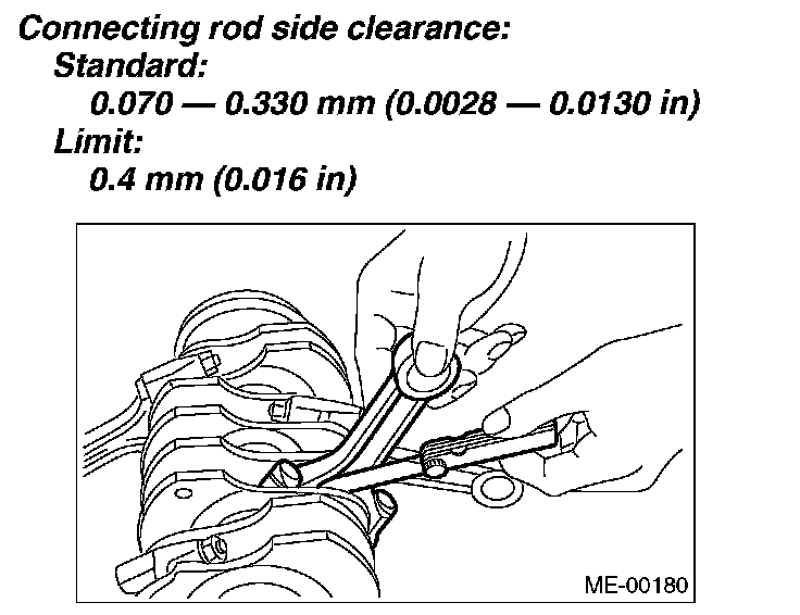 3) Install the connecting rod fitted with bearing to crankshaft and measure the side clearance (thrust clearance). If side clearance exceeds the limit, replace the connecting rod.