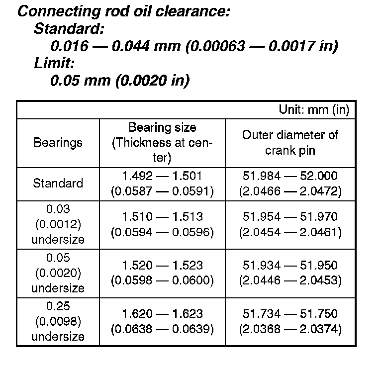 5) Measure the oil clearance on individual connecting rod bearings by means of plastigauge. If any oil clearance is not within the specification, replace the defective bearing with a new one of standard size or undersize as necessary. (See the table below.)